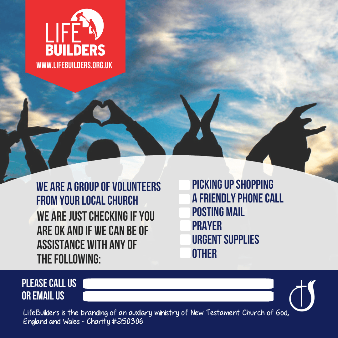 We’ve designed a community calling card that you can distribute in your area to offer your help to those that might need it. We have created a print-ready file so that your LifeBuilders group can get some printed and hand them out in your neighbourhood. We would strongly recommend you discuss with your local pastor and safeguarding lead. It's always useful to inform your local community police of your plans too.